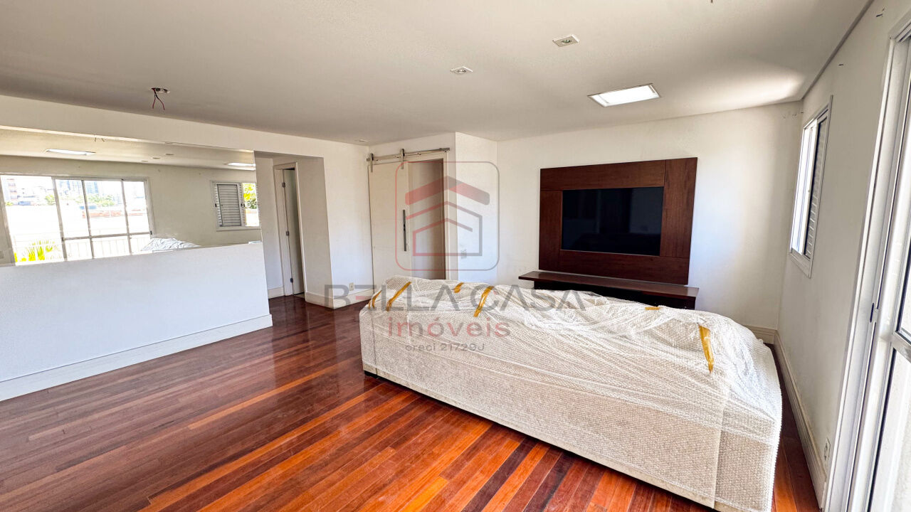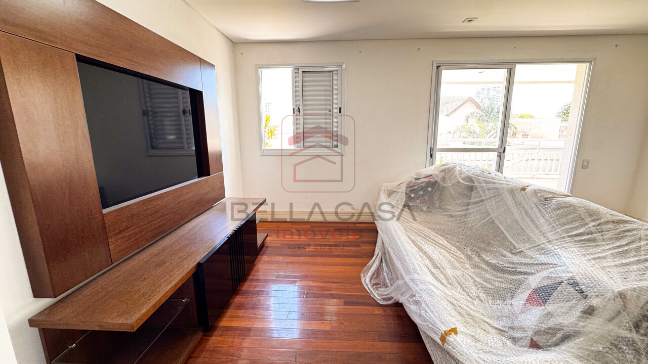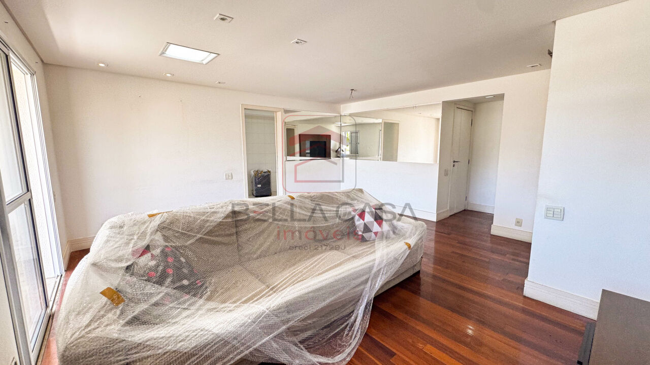 Sala para dois ambientes com muito espaço, piso de madeira, lavabo, detalhes em espelho, varanda gourmet enorme ponta a ponta com saida para a suíte e cozinha.