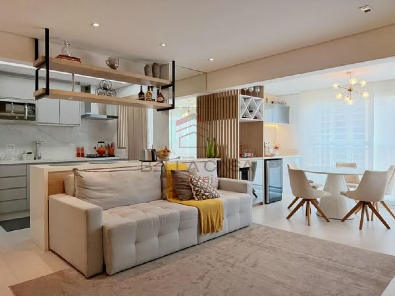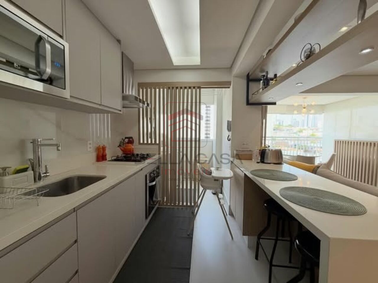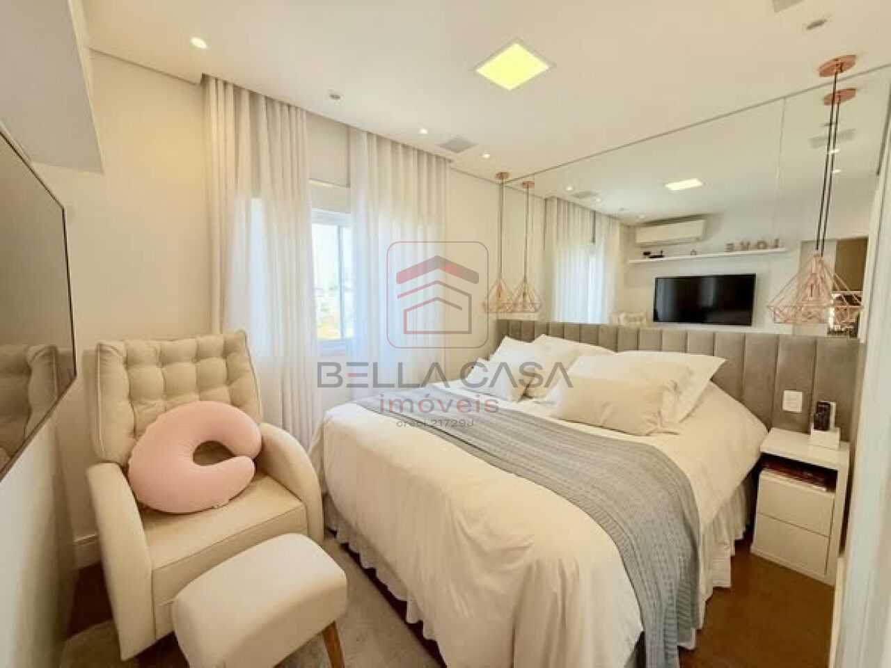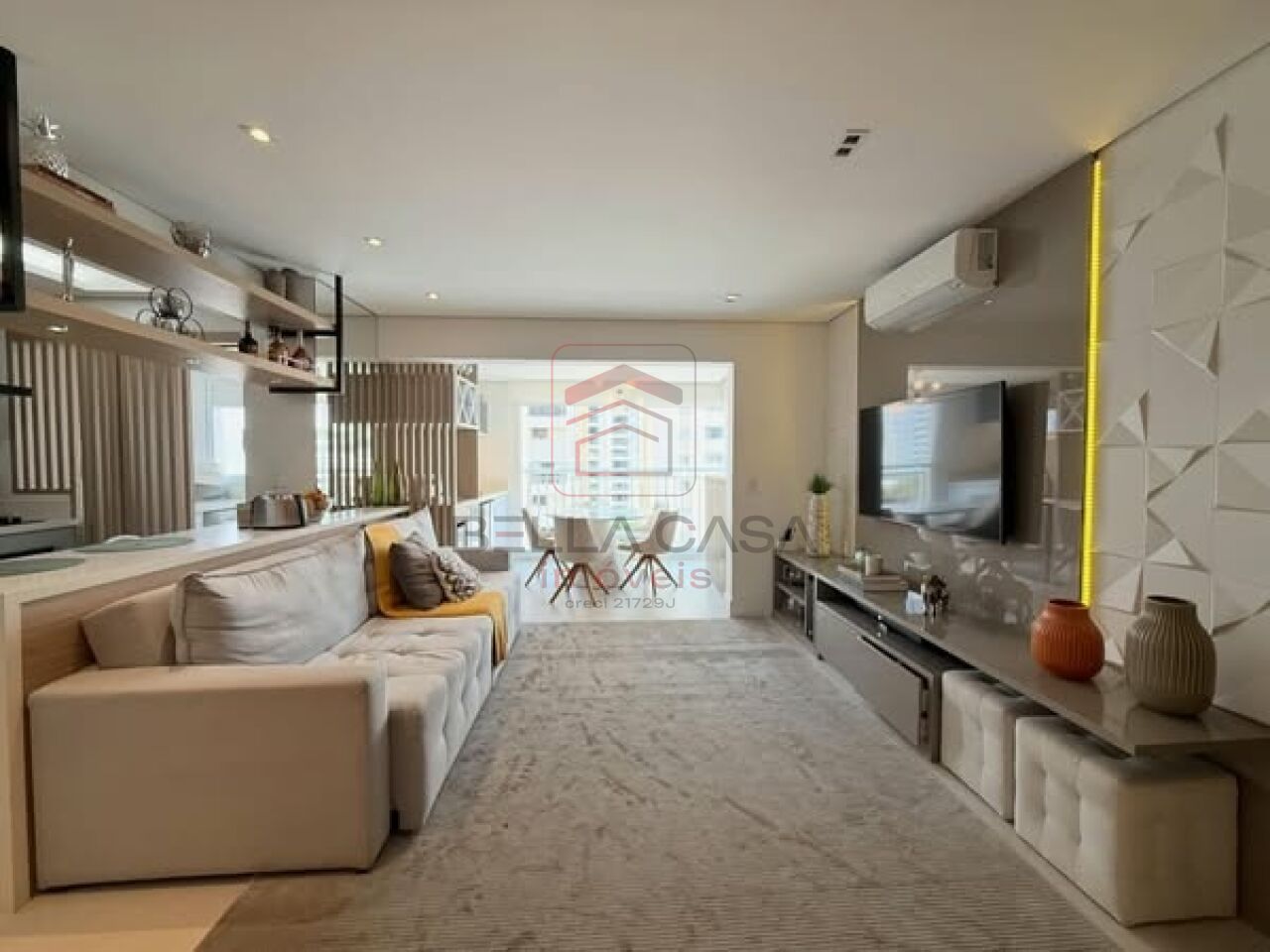 Apartamento novo, com todos os móveis planejados a partir de projeto feito com arquiteto. São dois quartos, sendo uma suíte, além de um quarto adicional utilizado para closet (não há foto no anúncio). São dois banheiros e um lavabo. Cozinha estilo americana. Sacada integrada. Ar condicionado nos quartos e na sala. Três vagas delimitadas na garagem.