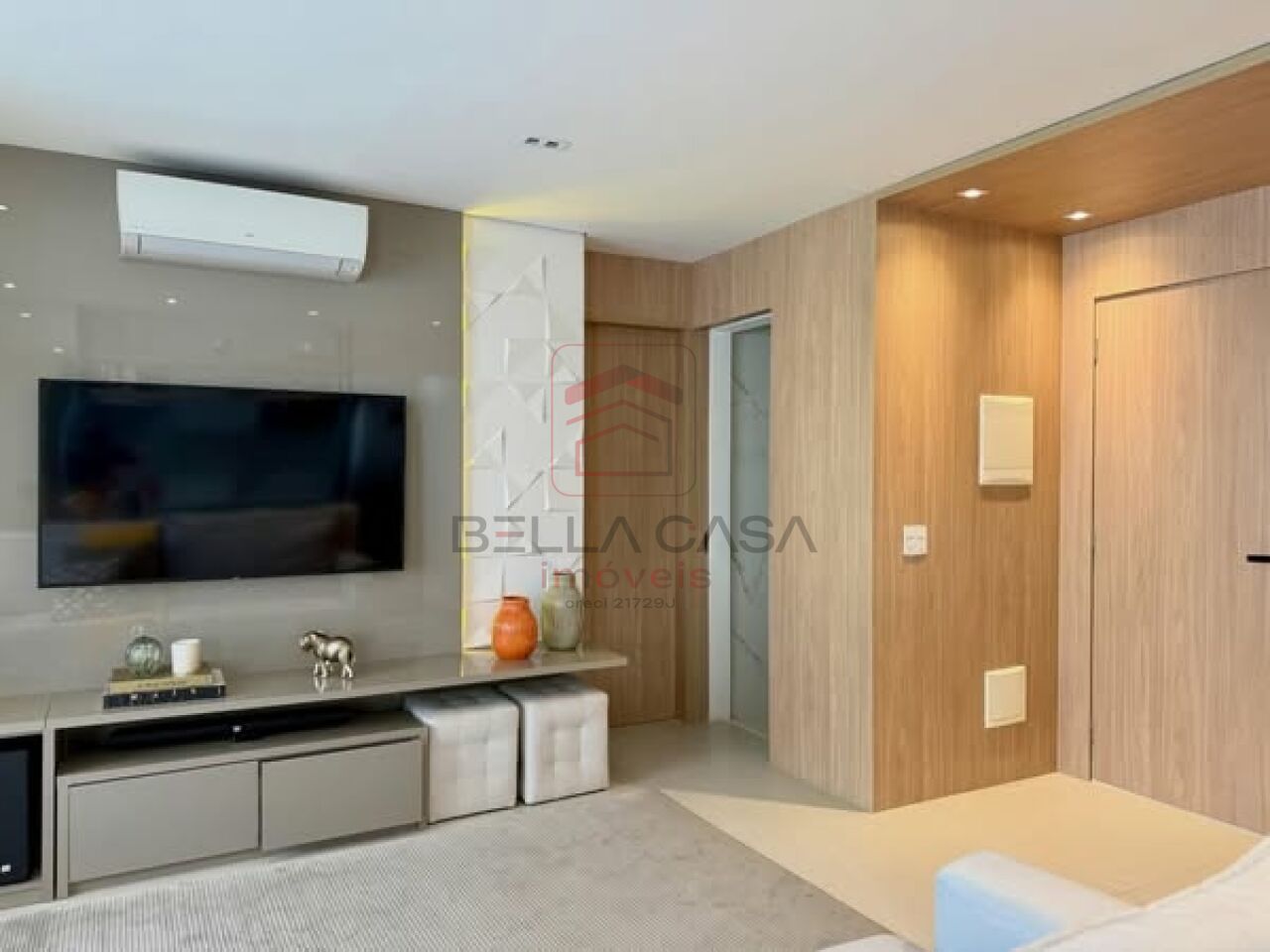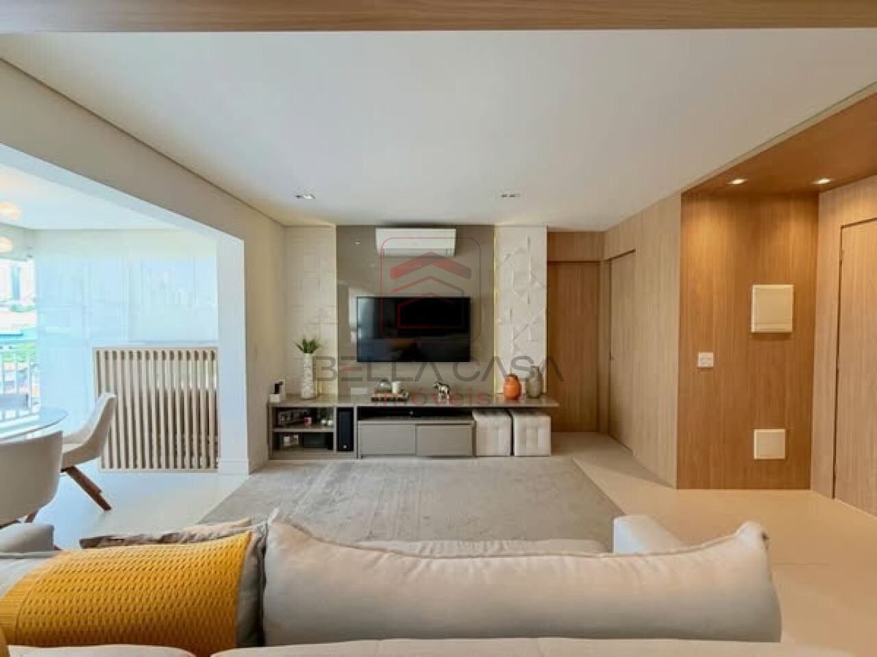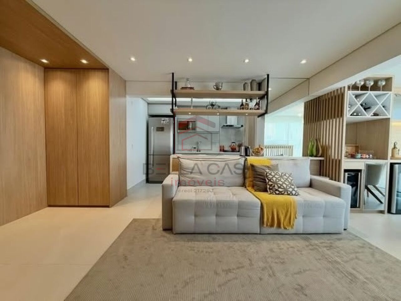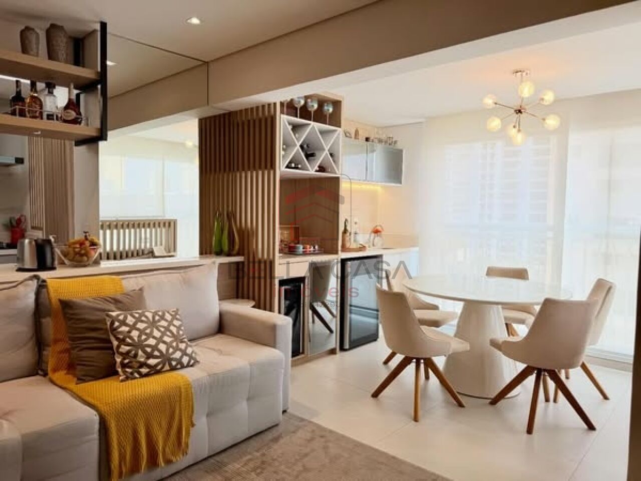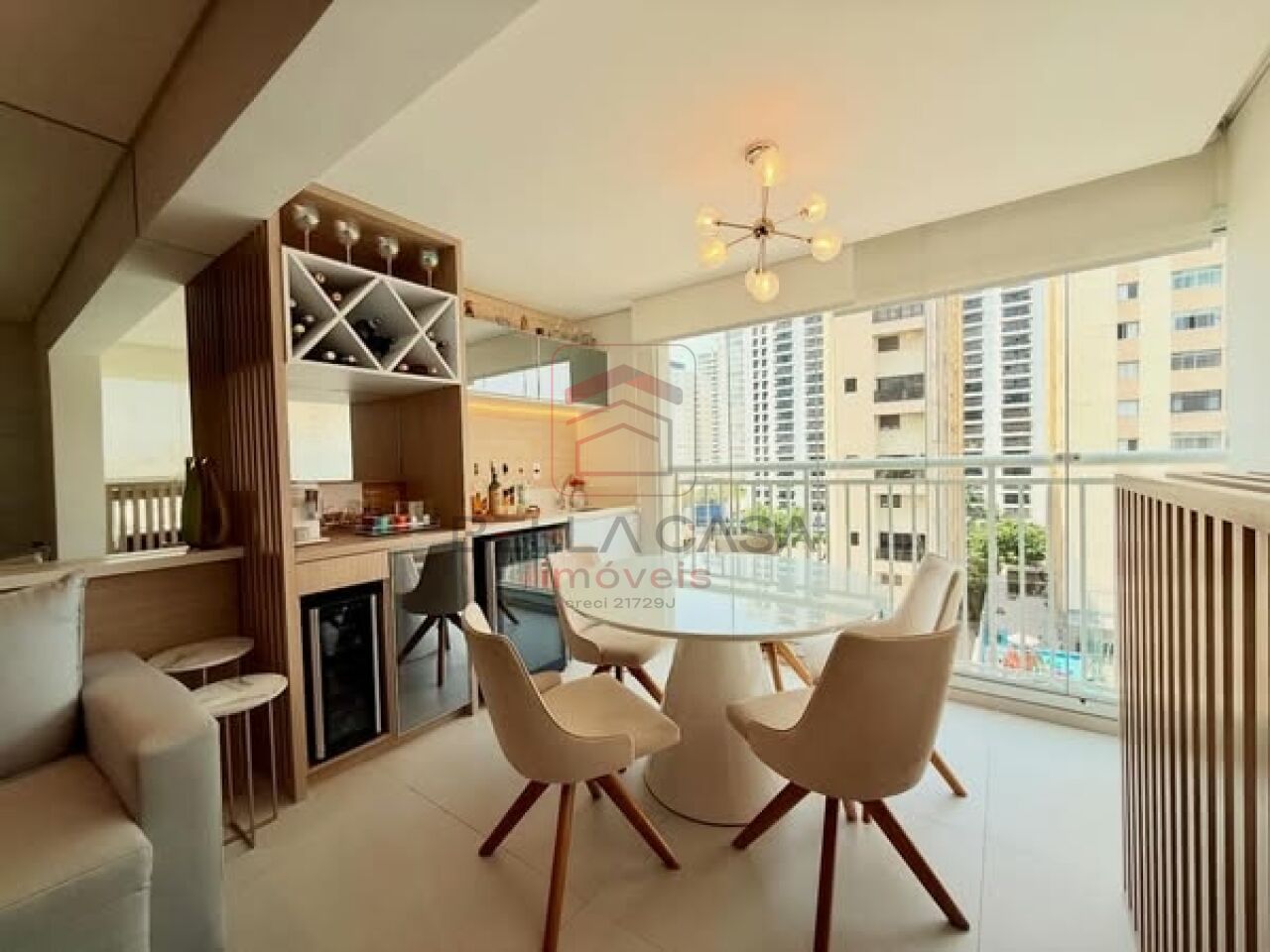 Apartamento novo, com todos os móveis planejados a partir de projeto feito com arquiteto. São dois quartos, sendo uma suíte, além de um quarto adicional utilizado para closet (não há foto no anúncio). São dois banheiros e um lavabo. Cozinha estilo americana. Sacada integrada. Ar condicionado nos quartos e na sala. Três vagas delimitadas na garagem.