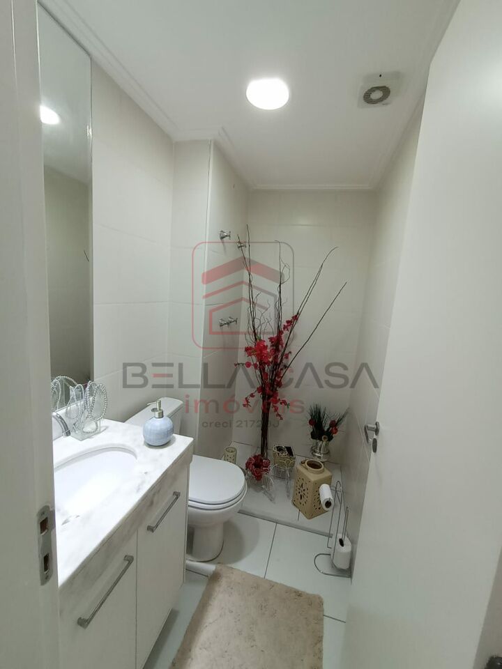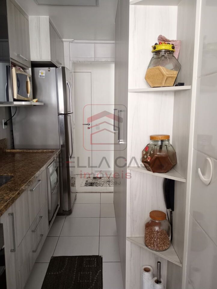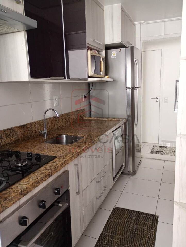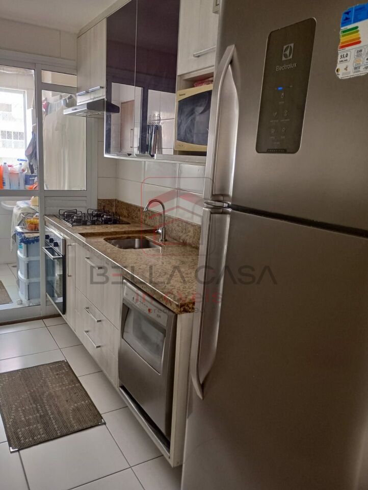 Sala dois ambientes, com painel de tv, os dois banheiros com box e armários, cozinha com armários, cooktop, forno elétrico, e lava louça embutidos, área com armário.