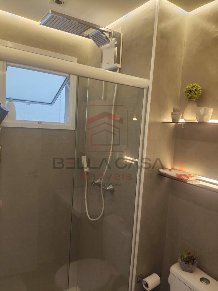 Banheiro social com armários, box, espelho, chuveiro todo equipado.