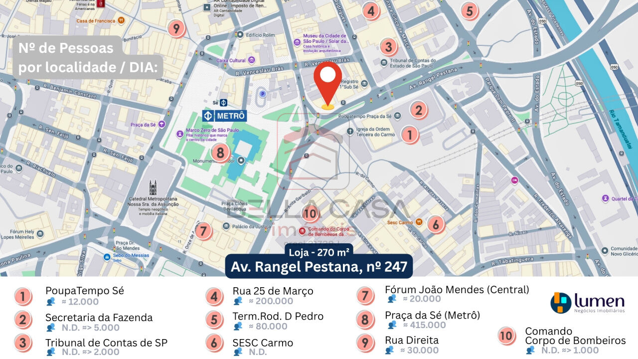 Localização estratégica, a apenas 200 metros do Metrô Sé, ao lado das avenidas 23 de Maio e do Estado, em frente ao Poupatempo e próximo ao Terminal Parque Dom Pedro II e à Rua 25 de Março, garantindo grande fluxo de pessoas e fácil acesso.