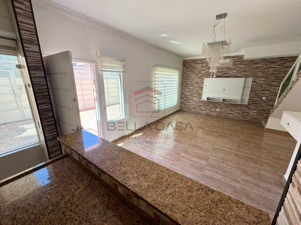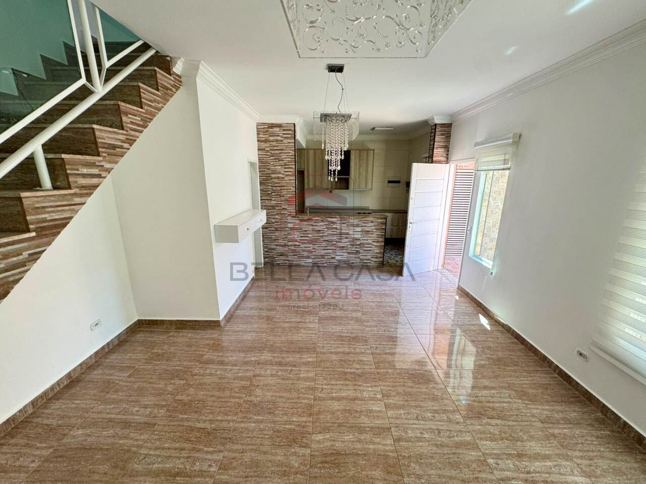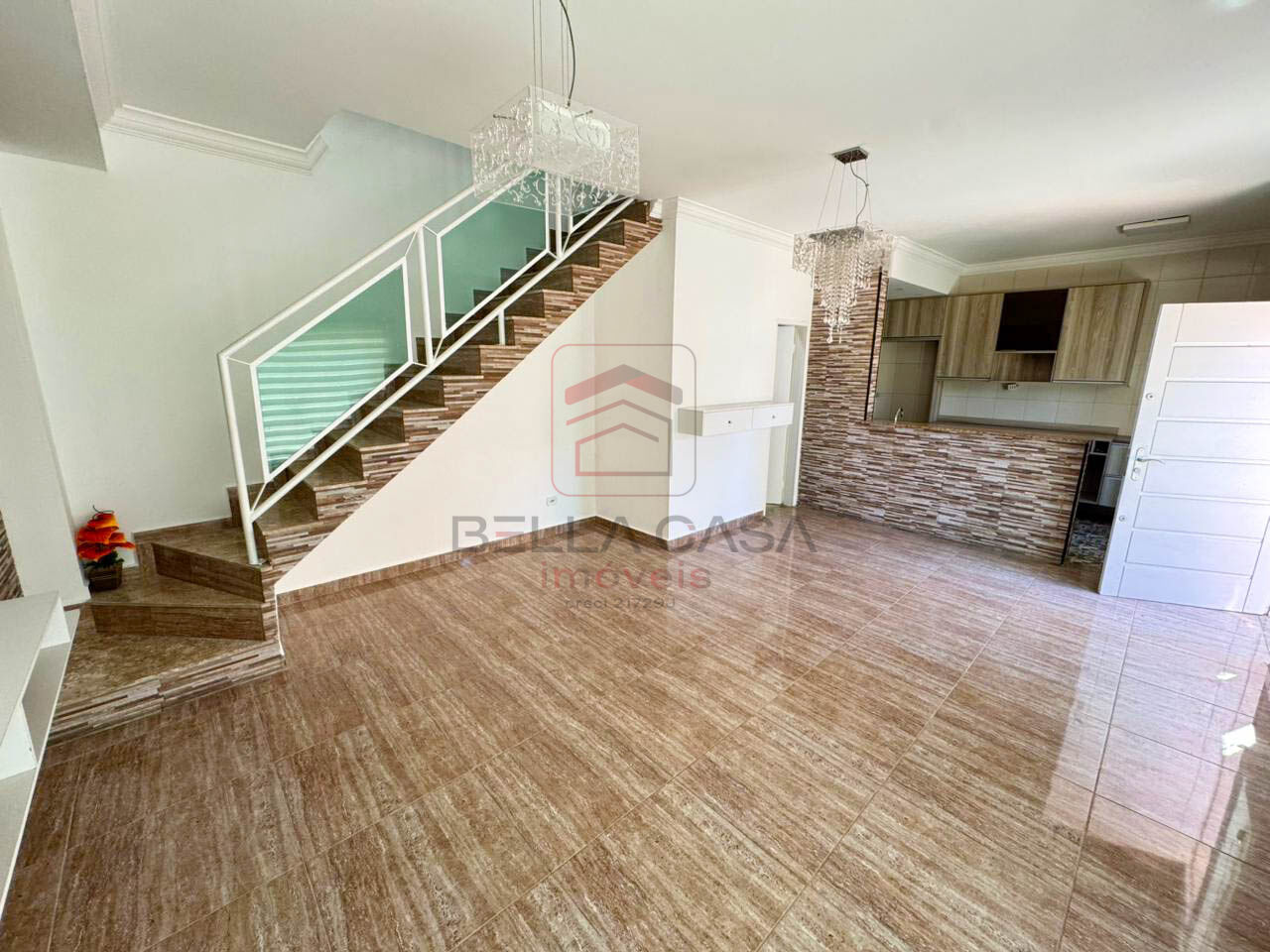 Sala para dois ambientes com piso em porcelanato, lavabo, cozinha americana com armários embutidos, lava louça e fogão.