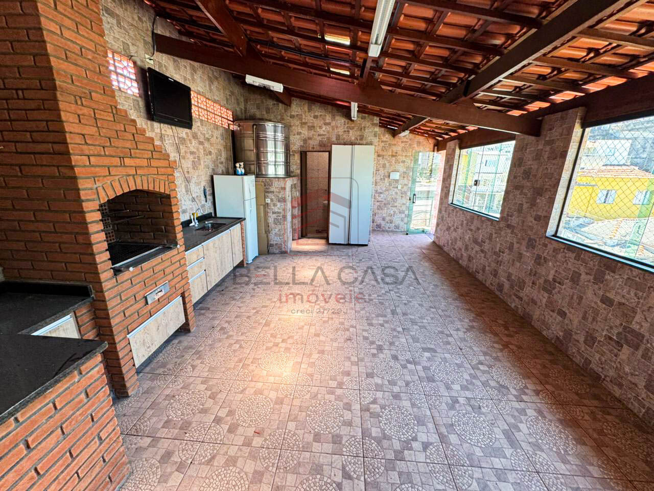 Parte superior com churrasqueira e salão de festas.